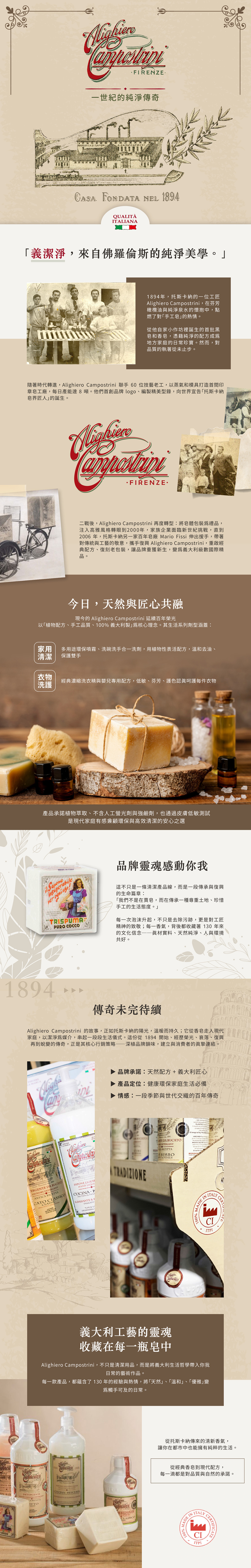 承襲義大利古老的香氛與清潔工藝傳統,Alighiere Campostrini 品牌以精湛手工與細膩品質著稱,致力於保留托斯卡尼地區的文化風格與獨特香氛魅力。