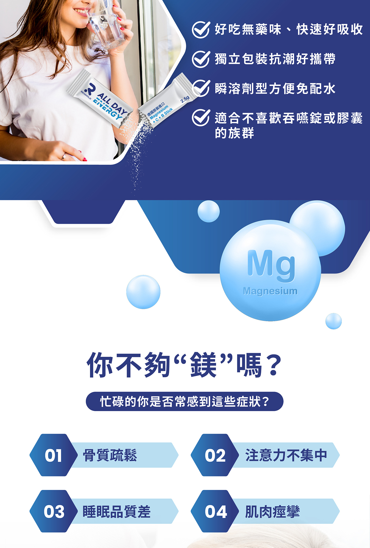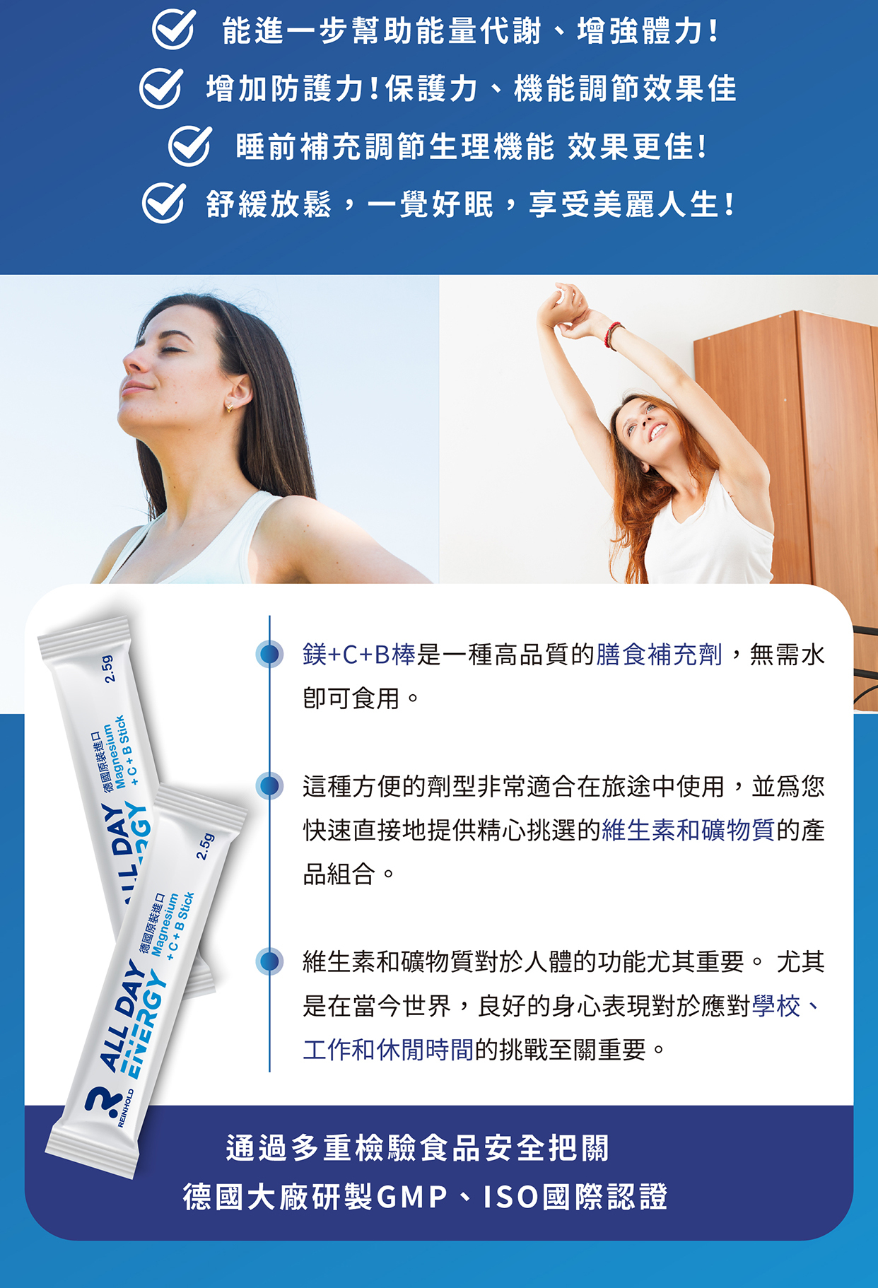 獨立小包裝,方便好攜帶,來自德國專業保健品牌的黃金配方,為您的日常補充鎂與多種維生素,改善睡眠品質與體能,為您打造活力滿滿的一天。