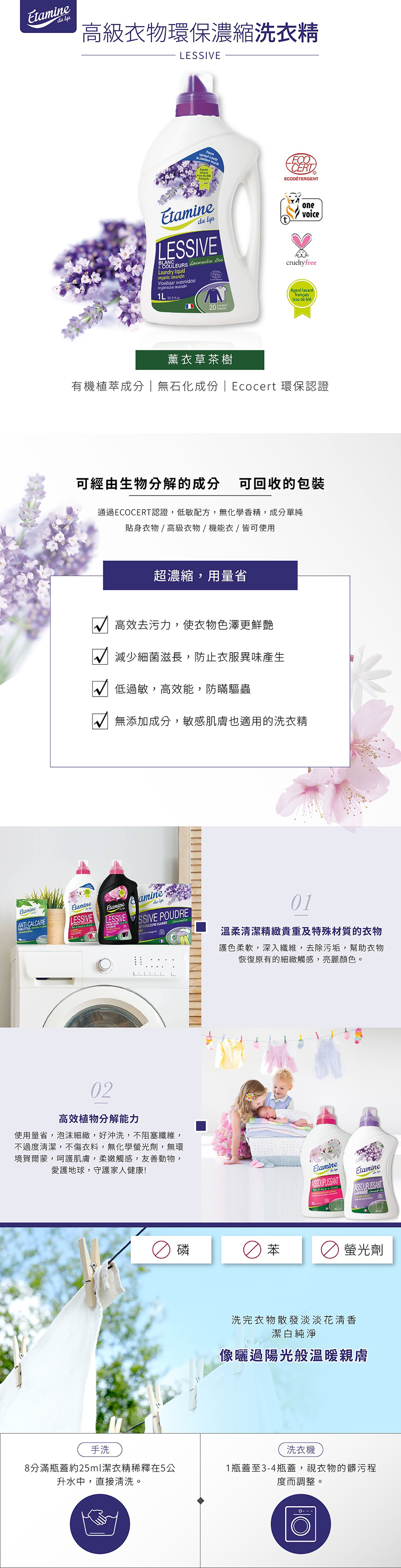 用途:適用於所有衣料的草本潔淨配方,泡沫細緻、不阻塞紡織纖維,溫和洗淨的去污力讓洗後衣物也能保持柔軟的細緻觸感,即使手洗也不刺激肌膚,使用劑量超經濟,輕鬆省水洗滌又環保,ECOCERT認證有保障。