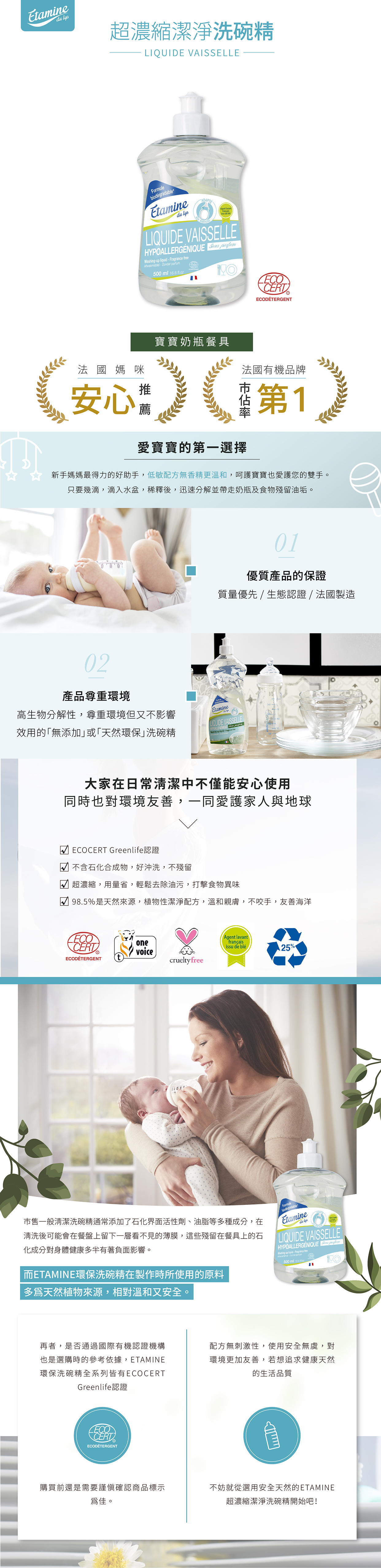 法國有機品牌市佔率第一,法國媽咪最安心的推薦。以小麥、甘蔗、椰子等植物取代傳統介面活性劑,無添加額外香料,以最純淨的方式製成的洗碗精,適合清洗寶寶的奶嘴、奶瓶等容易殘留奶垢的器具。