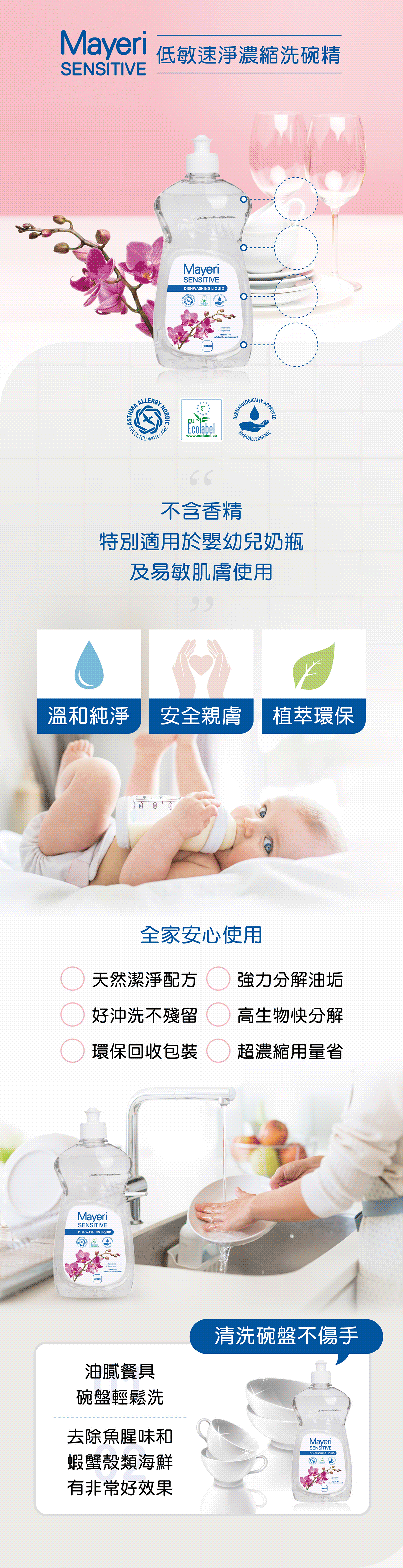 無添加額外香料,以最純淨的方式製成的洗碗精,適合清洗寶寶的奶嘴、奶瓶等容易殘留奶垢的器具,MAYERI的低敏系列,通過北歐過敏防治協會,產品不含致敏成分,是守護家人健康的實力之選。