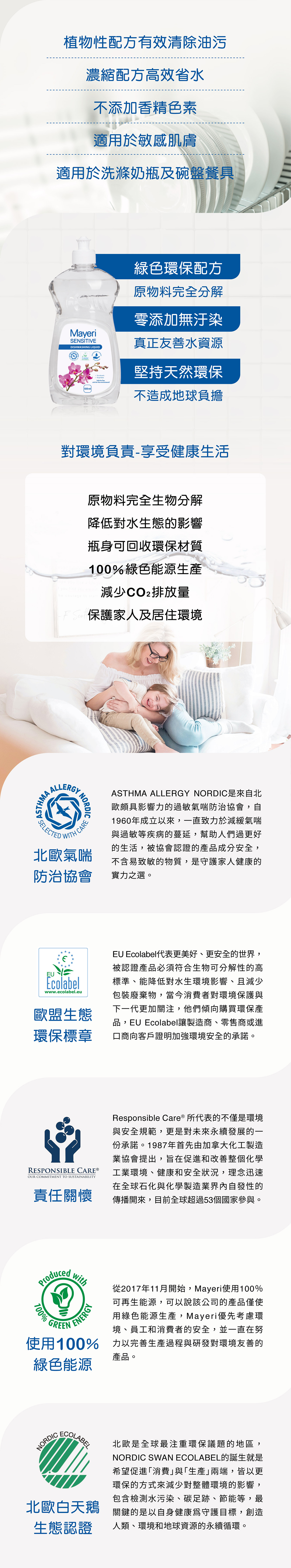 無添加額外香料,以最純淨的方式製成的洗碗精,適合清洗寶寶的奶嘴、奶瓶等容易殘留奶垢的器具,MAYERI的低敏系列,通過北歐過敏防治協會,產品不含致敏成分,是守護家人健康的實力之選。