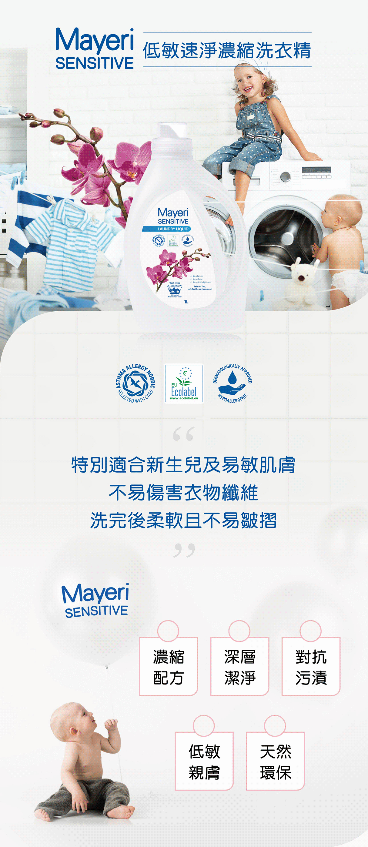 用途:專為敏感肌膚設計的低敏速淨配方,低泡沫、不阻塞紡織纖維,適用嬰幼兒衣物與貼身衣物,特含源自天然的淨化酵素,能溫和清除髒汙,適用軟硬水質,機洗手洗都適用,使用劑量超經濟,輕鬆省水洗滌又環保,EU Ecolabel認證有保障。
