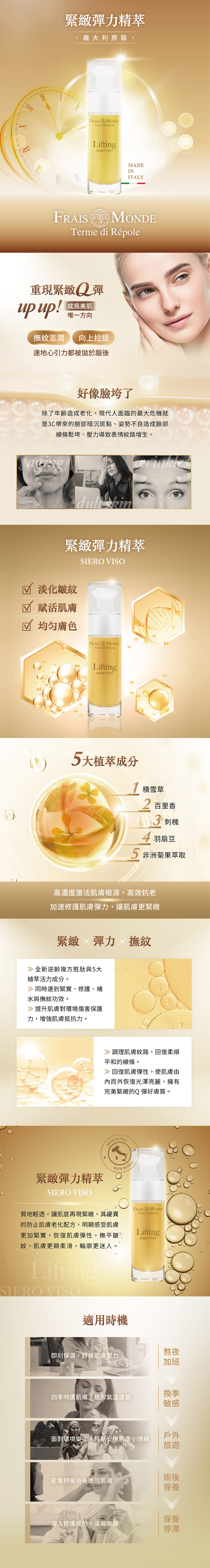 萃取自全新逆齡複方胜肽及積雪草等五大植萃成分,質地輕透,一滴精華為肌膚重現緊緻Q彈,由內而外恢復光澤亮麗。